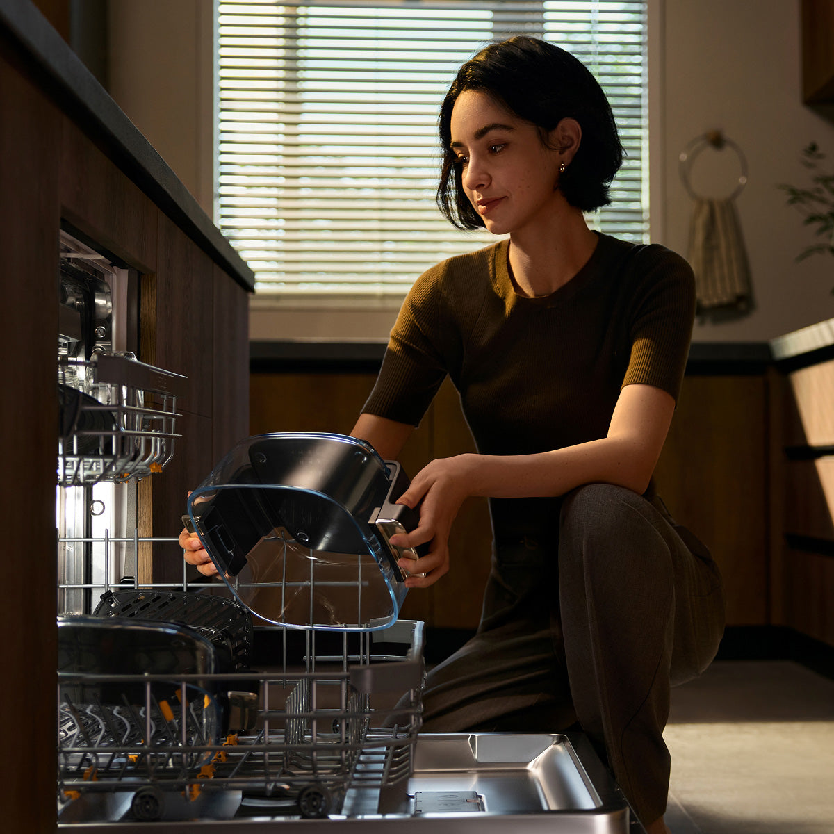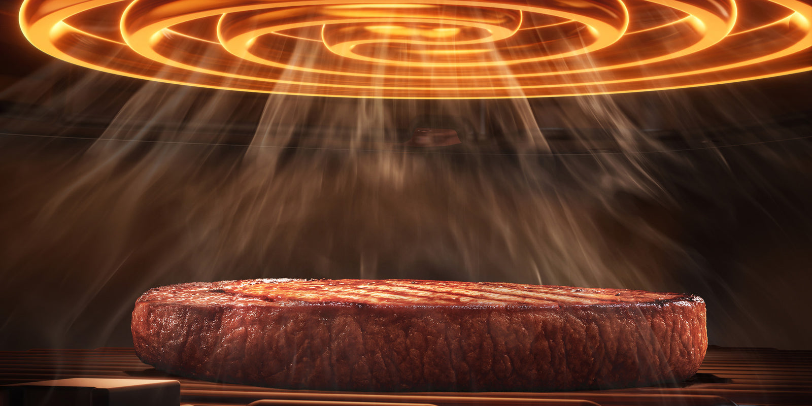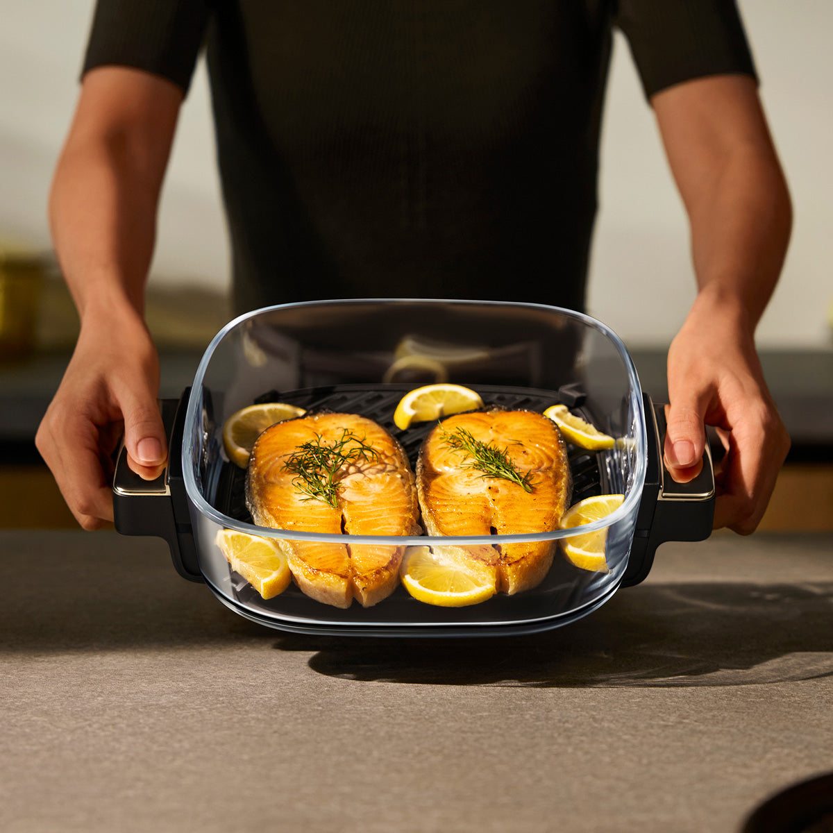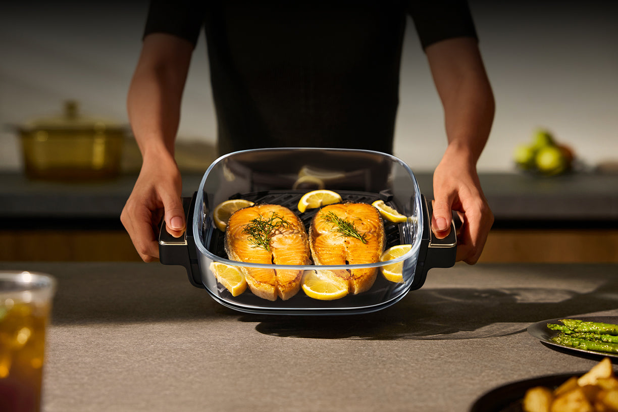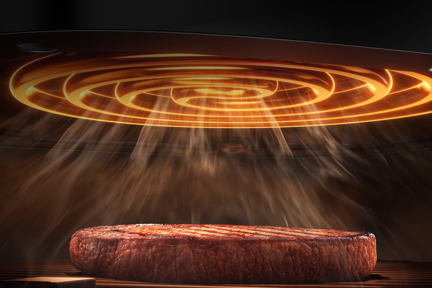 Le moteur sans balais entraîne intelligemment la circulation d'air à grande vitesse, en ajustant le débit d'air selon les besoins pour rendre l'extérieur croustillant tout en conservant l'humidité pour des résultats uniformes et juteux. Des évents plus larges et un plateau de cuisson ondulé améliorent la répartition de la chaleur.