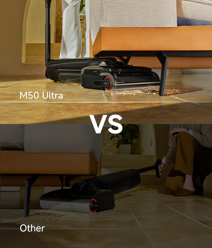 Le M50 Ultra offre une puissance d'aspiration impressionnante de 22 000 Pa, pour s'attaquer à divers types de salissures, solides comme liquides, en surface ou incrustées. En outre, il applique une pression vers le bas d'environ 20 N pour frotter vos sols, éliminant ainsi efficacement les taches les plus tenaces.