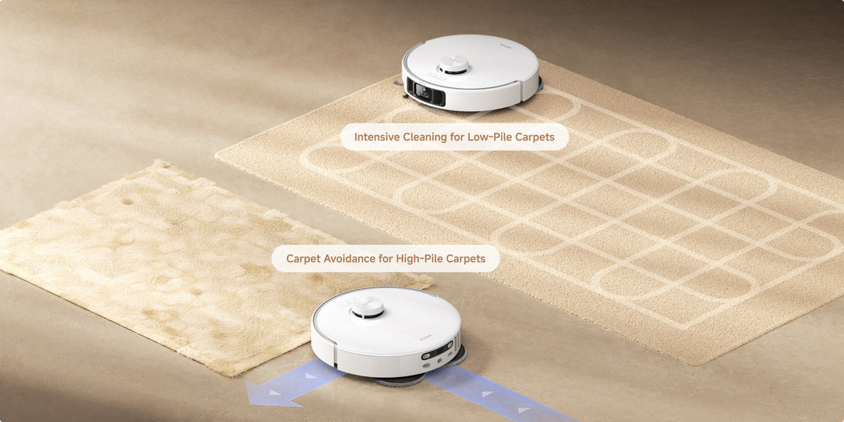 * Pour les tapis avec des poils de plus de 3 mm, nous vous conseillons de configurer le robot aspirateur pour qu'il évite les tapis et moquettes à poils moyens et longs via l'application de nettoyage et qu'il protège vos tapis et moquettes de l'humidité.