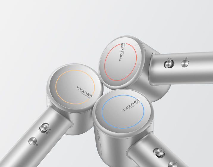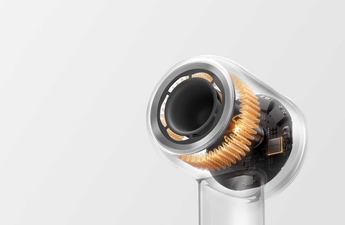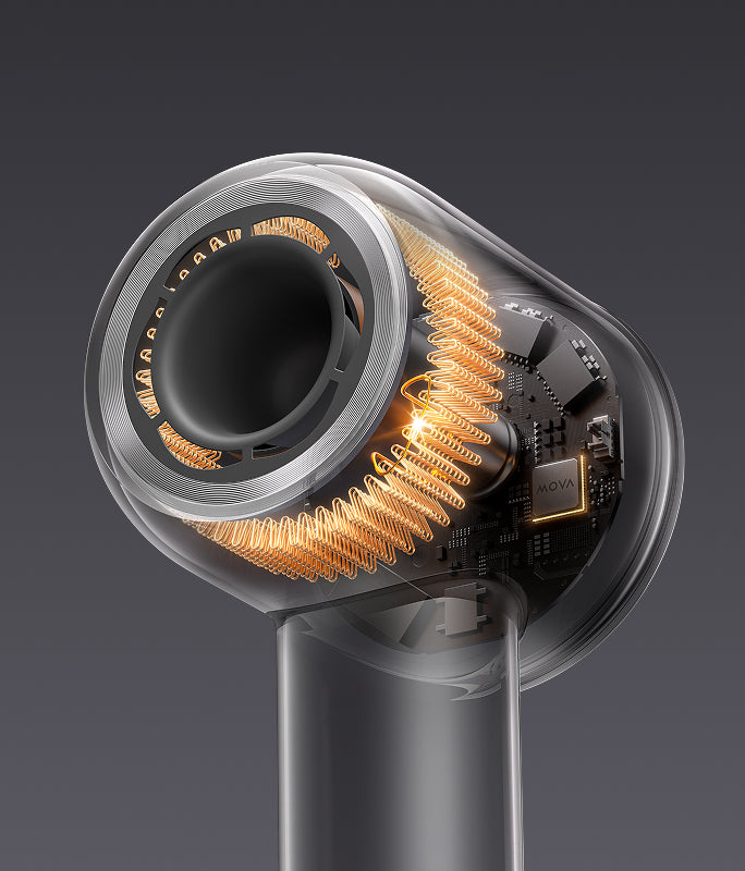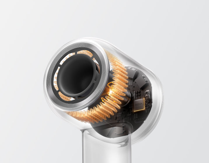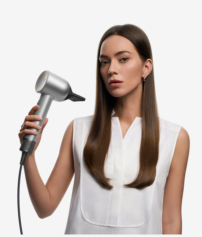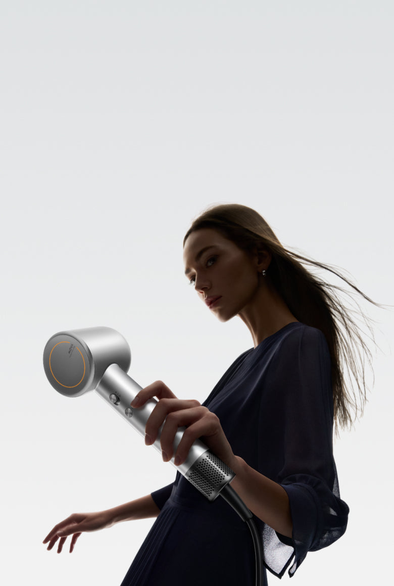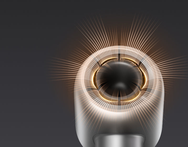 Le Shine 10 est également équipé d'un puissant moteur à grande vitesse. Son moteur sans balais de 110 000 tr/min, combiné aux sorties d'air en forme de fleur, délivre une grande vitesse et un débit d'air uniforme, capable de décoller les cheveux mouillés lourds et d'atteindre les racines. Le puissant débit d'air sous pression élimine rapidement l'humidité à la surface du cuir chevelu.