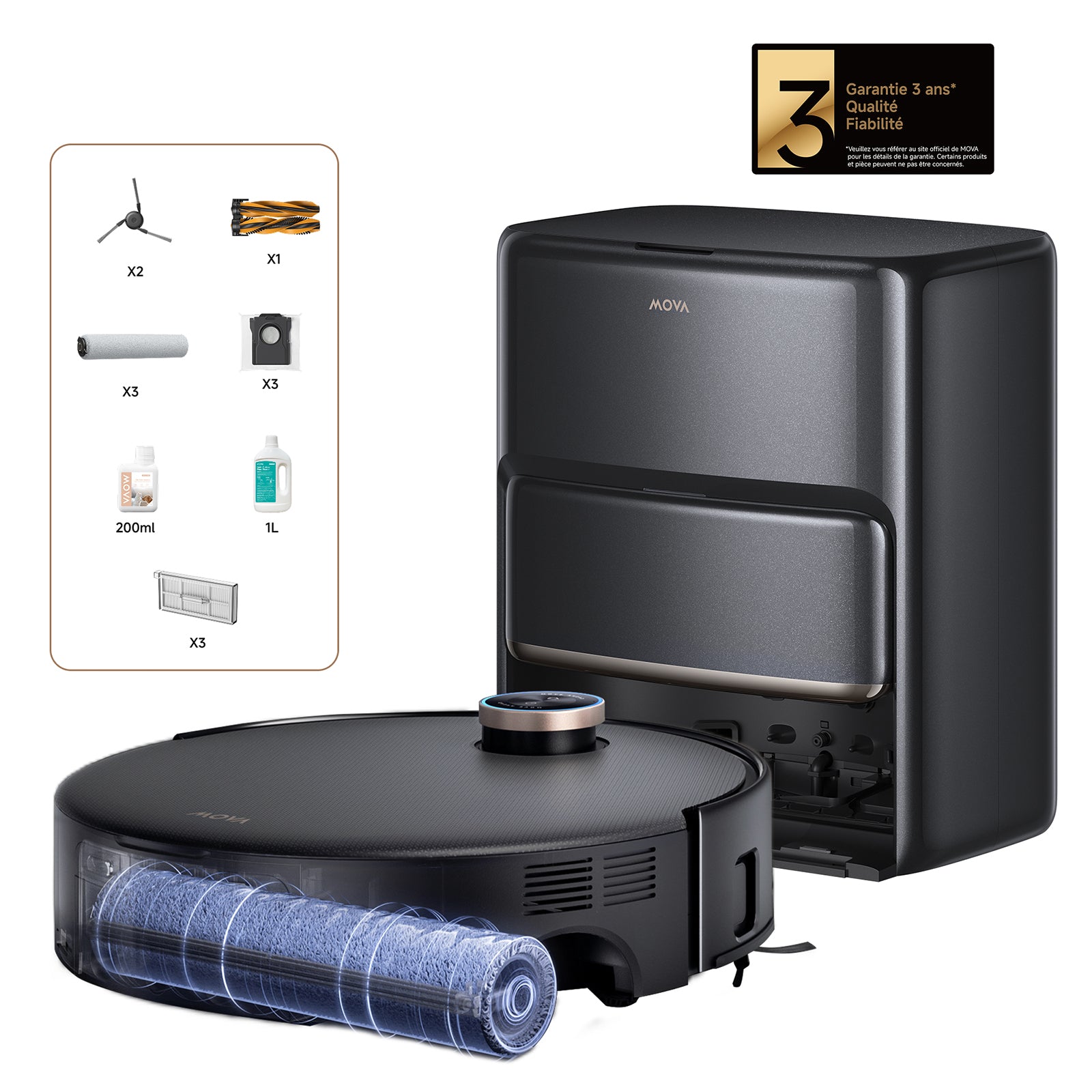 *Kit d’accessoires supplémentaires inclus avec le MOVA Z60 Ultra Roller Complete : Brosse principale ×1, Brosses latérales ×2, Filtres pour bac à poussière ×3, Sacs à poussière ×3, Serpillières à rouleau ×3, Solution nettoyante (1 L) ×1, Solution anti-odeurs pour animaux (200 ml) ×1, Solution nettoyante x1