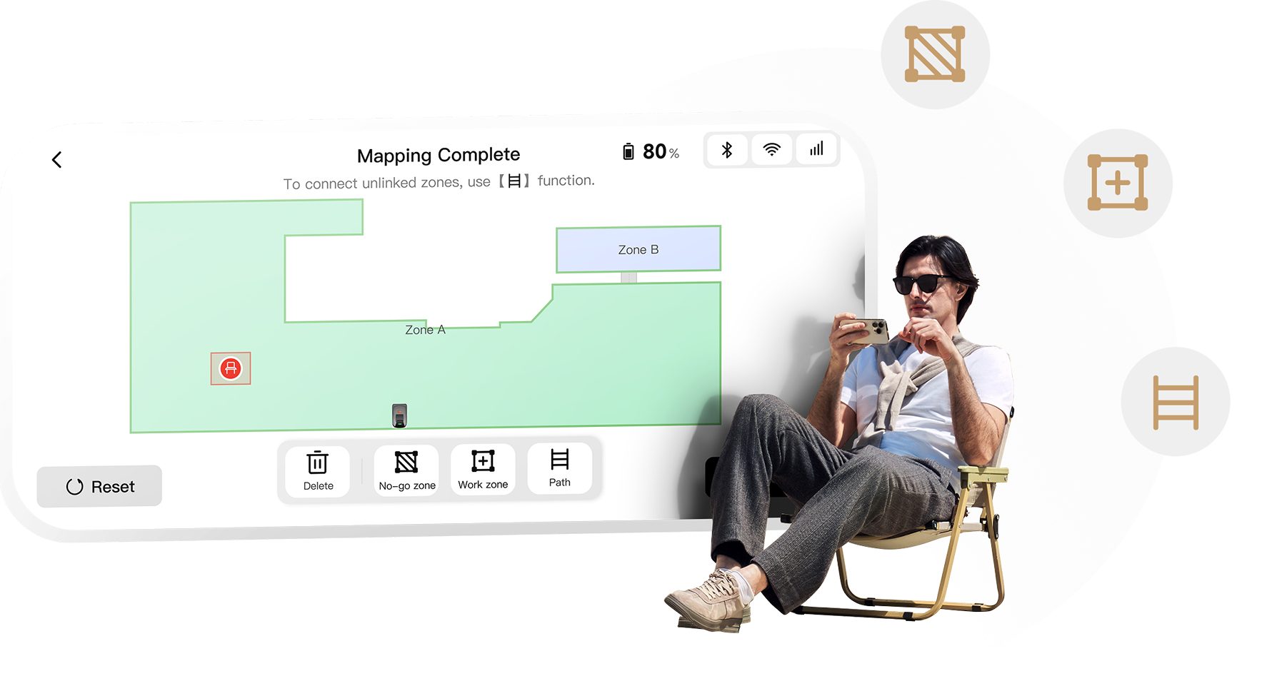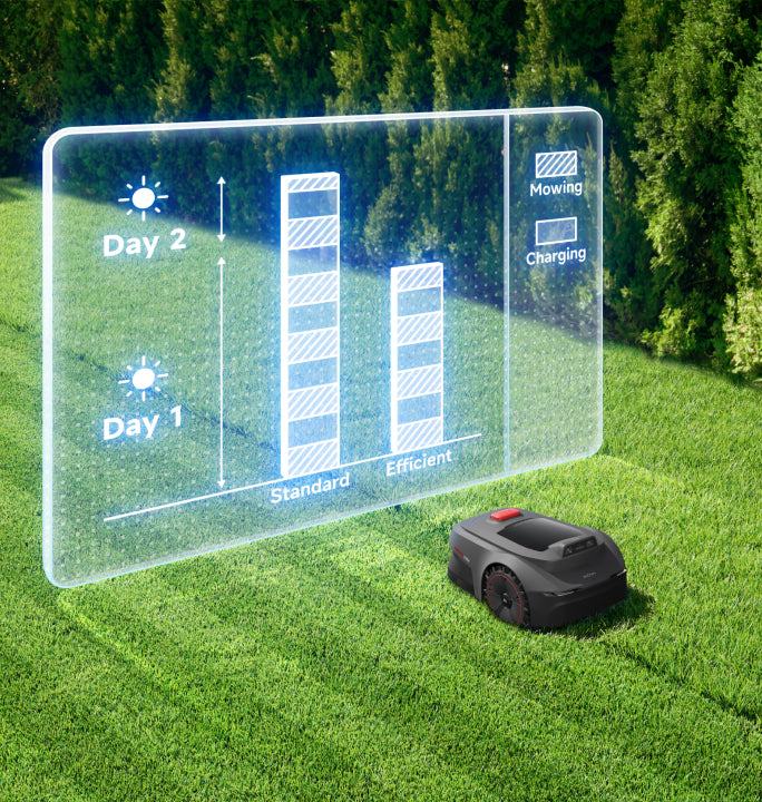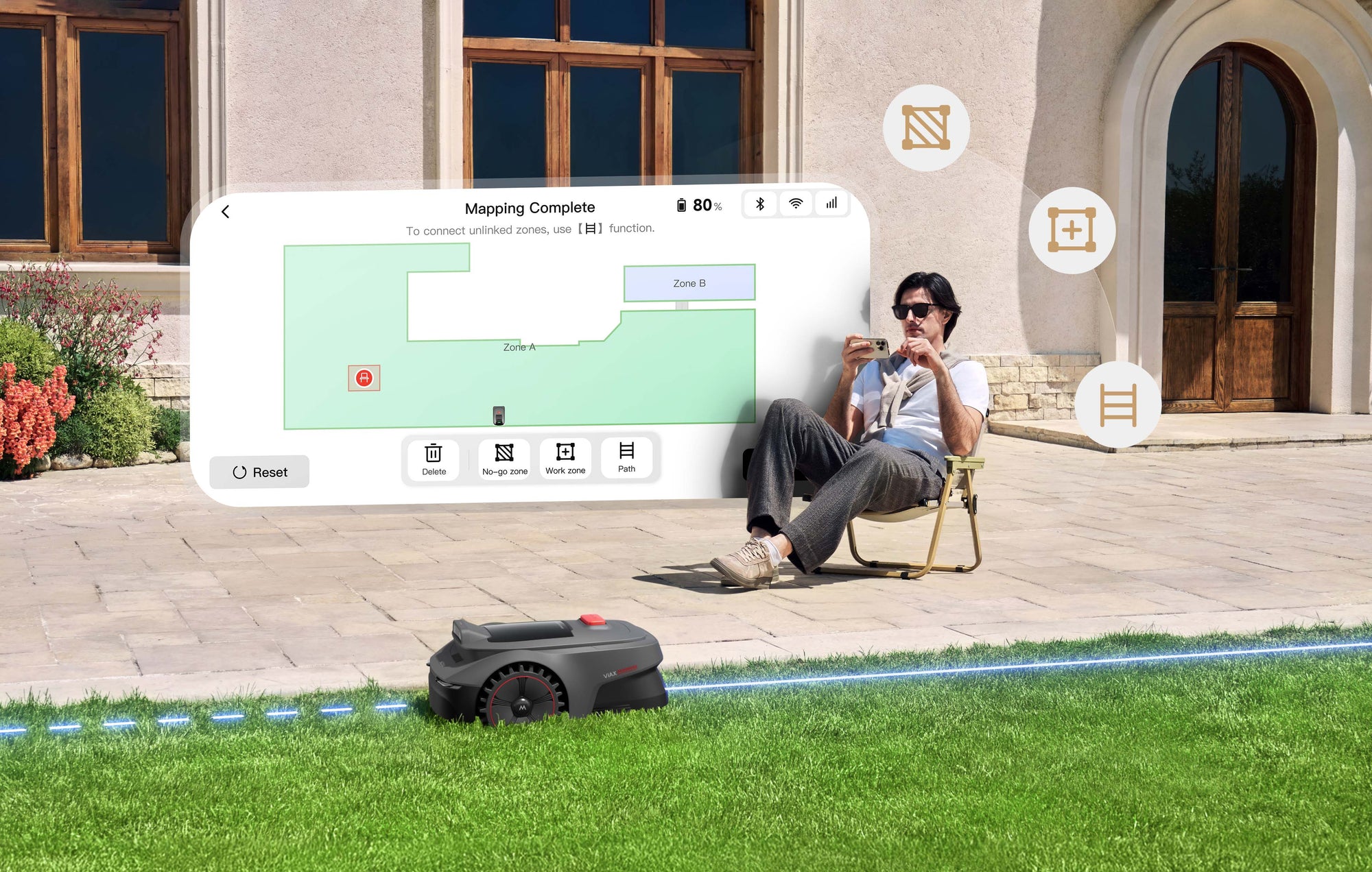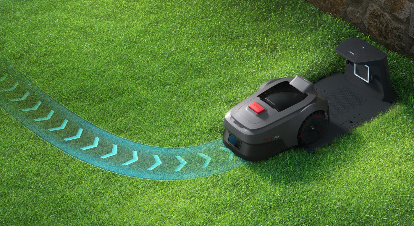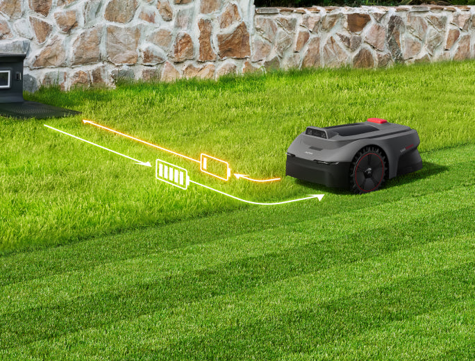 Il suffit de connecter la tondeuse robot à votre smartphone et de définir, en quelques clics dans l’application MOVAhome, les limites virtuelles, les zones de tonte multiples, les zones interdites ainsi que les passages entre différentes sections.
