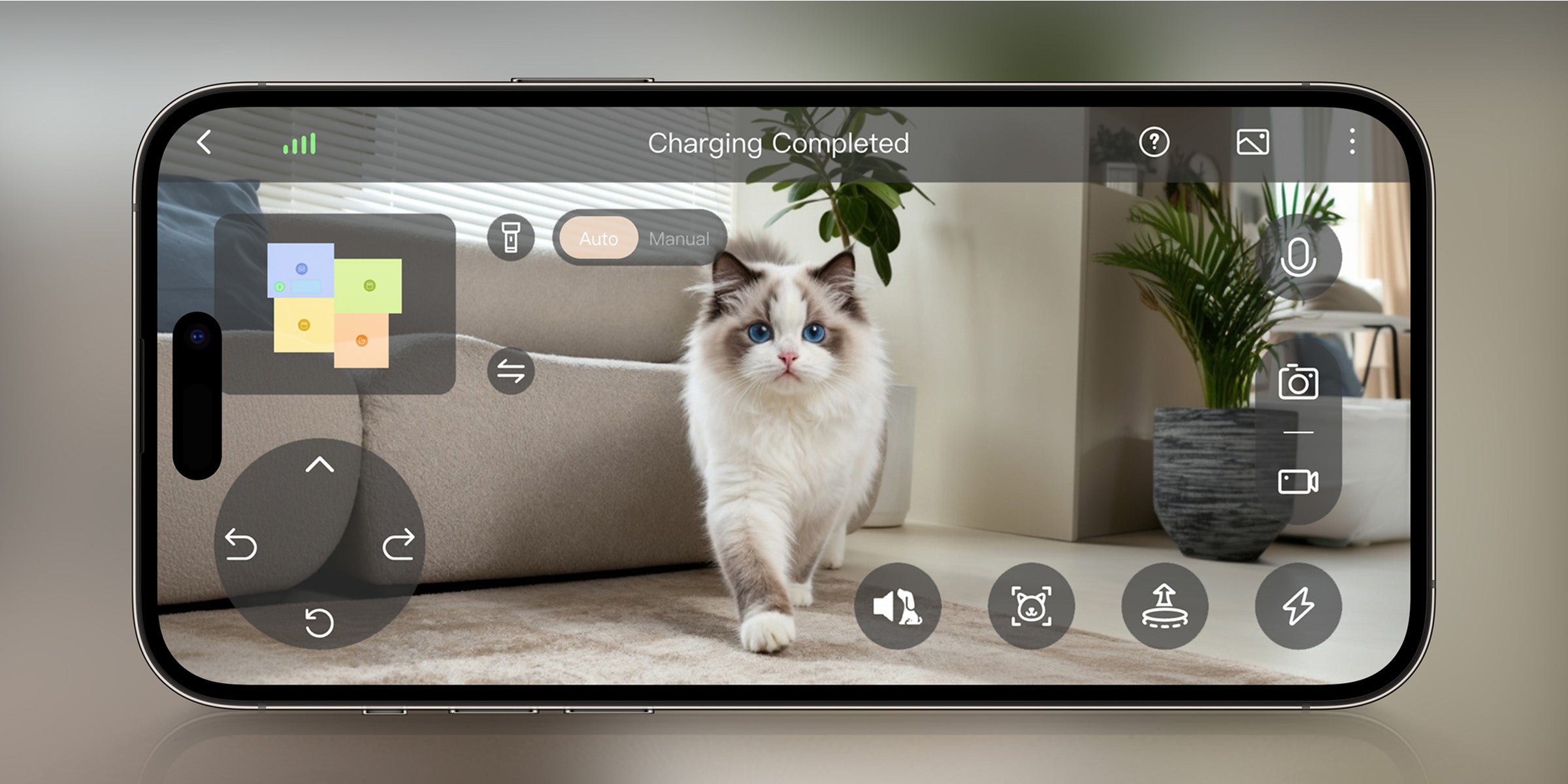 Le mode AI-PetMate cartographie les zones pour animaux pour un nettoyage en profondeur sans dégâts, joue avec vos compagnons quand vous êtes absent et capture leurs moments adorables. Plus qu’un robot, un vrai allié pour vos animaux.